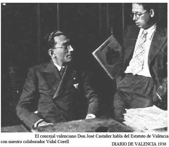 Otro dia, ese mismo concejal, don José Castañer Fons, presentó al Ayuntamiento una proposición encaminada a que la corporación iniciara gestiones para conseguir el estatuto de Valencia. Al conocerse la proposición del señor Castañer Fons han llegado al ayuntamiento telegramas de adhesión y centenares de pliegos con firmas de valencianos que piden el Estatuto Valenciano.